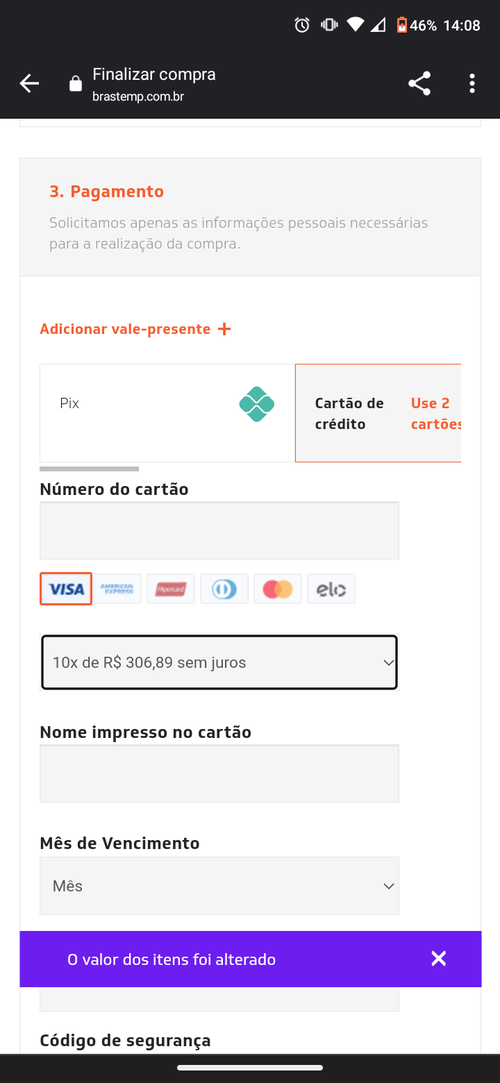 Aqui deu R$ 2669,10 (sem o frete) no pix ou 1x cartão.Ainda assim considero um bom preço.Considerando o cashback da promoção Brastemp de R$ 300 acho que vale muito a pena!Aqui chega nos 2700 mas na hora de colocar o cartão o valor altera