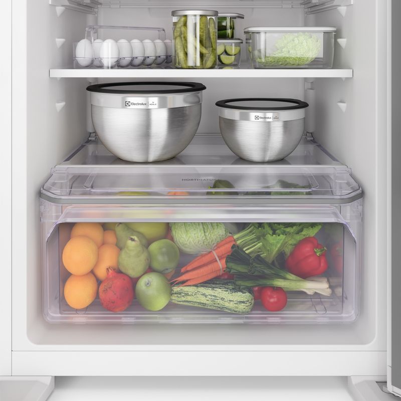 Essa geladeira Frost free conta ainda com a gaveta hortinatura, que preserva frutas e verduras em até 60% mais tempo***, se comparado com equipamentos que possuem gavetas comuns. ***Teste aferido em folhas verdes. (*) Maior freezer do segmento top freezer combinado frost free até 500 litros conforme tabela de eficiência energética de 19/10/2018 PBE (Programa Brasileiro de Etiquetagem)