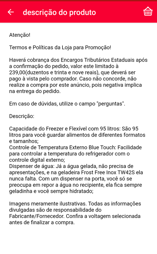 "Atenção!Termos e Políticas da Loja para Promoção!Haverá cobrança dos Encargos Tributários Estaduais após a confirmação do pedido, valor este limitado à 239,00(duzentos e trinta e nove reais), que deverá ser pago à vista pelo comprador. Caso não concorde, não realize a compra por este anúncio, pois negativa implica na entrega do pedido.Em caso de dúvidas, utilize o campo "perguntas".