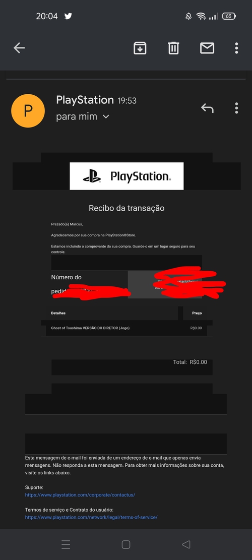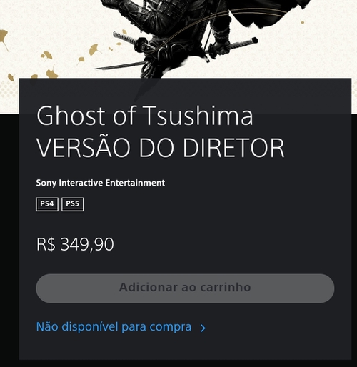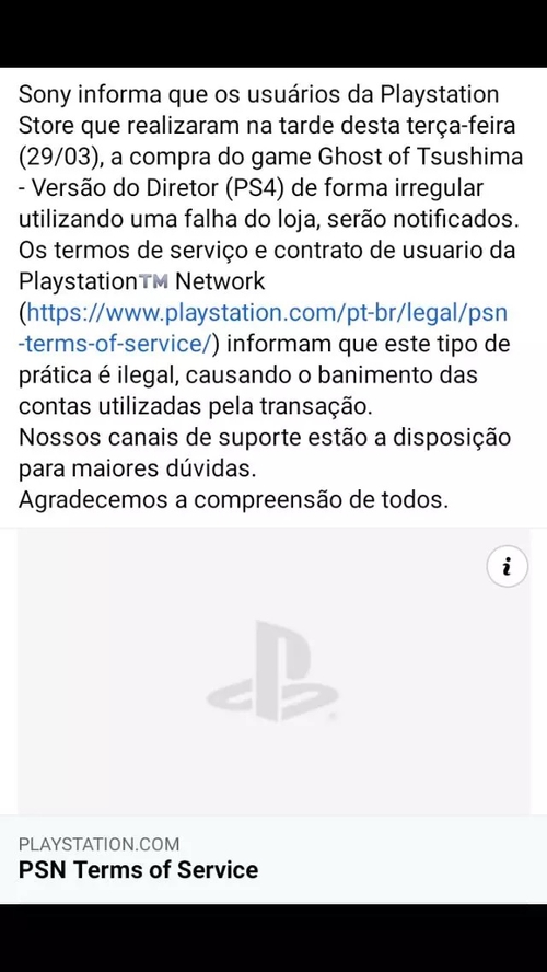 *Sony informa que os usuários da Playstation Store que realizaram na tarde desta terça-feira (29/03), a compra do game Ghost of Tsushima - Versão do Diretor (PS4) de forma irregular utilizando uma falha do loja, serão notificados. Os termos de serviço e contrato de usuario da Playstation™ Network (playstation.com/pt-br/legal/psn-term...vice/) informam que este tipo de prática é ilegal, causando o banimento das contas utilizadas pela transação.
