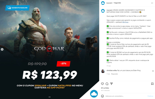 Eita, uma pena que meu orgulho me impede de usar a desgraça do picpay. Ainda não superei o golpe no meu cupom de 50 reais.