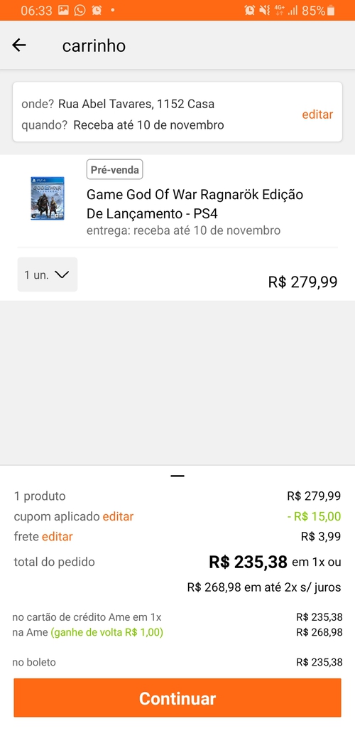 Inválido aqui. mas eu abri o aplicativo apareceu 263 frete gratis ... e pagando a vista desconto de 36 reias. so que o aplicativo bugou aqui e depois mostrou o valor do jogo 299.