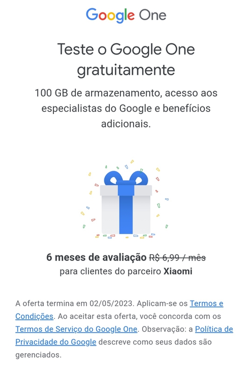 6 meses grátis de Google ONE (armazenamento na nuvem, 100gb) para usuários Xiaomi, consegui no meu Redmi note 11s, pela lista de modelos creio que é a partir da série 10. Necessário baixar o app no celular da Xiaomi, ao entrar com a conta ele vai verificar se o celular é válido para a promoção.