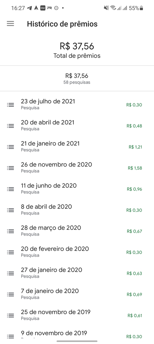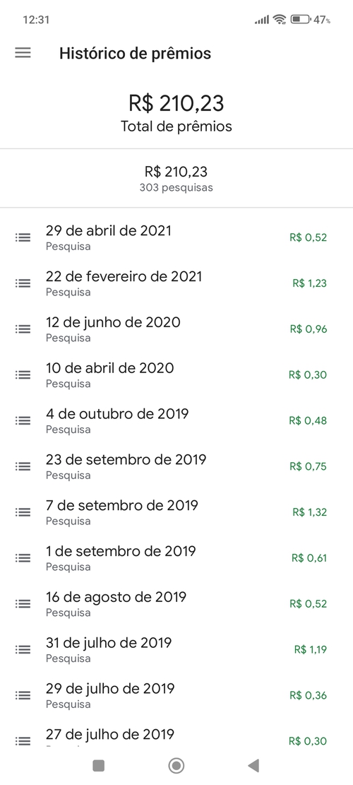 Uso desde 2015 e no total só consegui R$ 31,18. Achei que trabalhando na zona sul e no Centro do Rio viriam muitas pesquisas, mas me enganei.