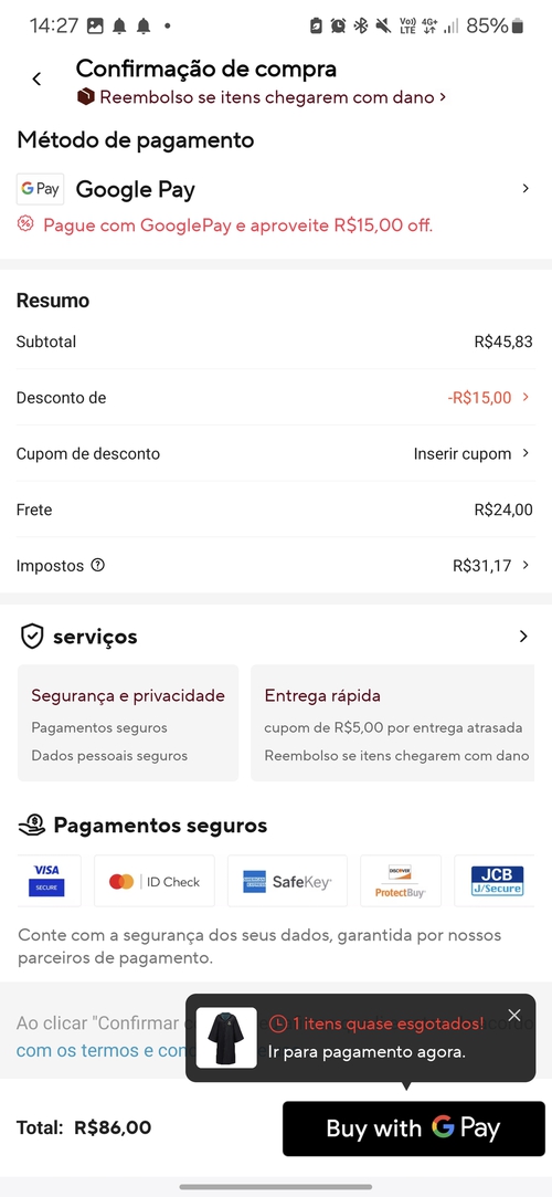 - Quando o produto da promoção aparecer no aplicativo do Aliexpress, prossiga até o final, na tela de "Confirmação do pedido".
