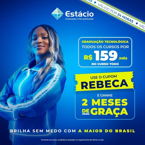 Utilize o cupom REBECA e ganhe dois meses gratis na ESTÁCIO em qualquer curso (tirando medicina, gastronomia e alguns que eles falam no regulamento).