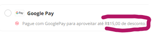 Selecionem Google Pay como forma de pagamento para R$15 de desconto!