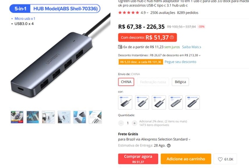 HUB USB-C COM 4 PORTAS USB 3.0 E 1 PORTA MICRO-USB (USB-MINI) | R$41