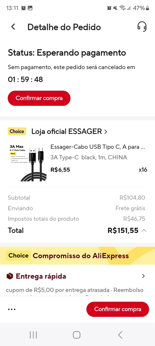 [Imposto Incluso] Essager-Cabo USB Tipo C, A para Tipo C, Cabos de carregamento rápido para iPhone 15, Samsung, Xiaomi