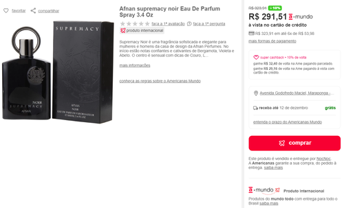 [Internacional AME R$ 262,35] Perfume Afnan supremacy noir Eau De Parfum Spray 3.4 Oz