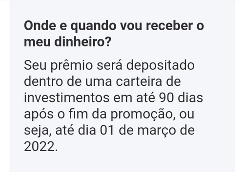 Eu conversei com eles e pra quem está com dúvida.. você transferi até 300 reais para a sua conta e deixar investido la ou deixar parado no saldo e em até 90 dias após o termino da promoção eles vão depositar mais 300 reais na sua conta (o dobro do valor do primeiro depósito) porém você não pode sacar esse valor antes dos 90 dias.. senão você perde o bônus, ou seja vc só vai poder sacar depois que cair o bônus