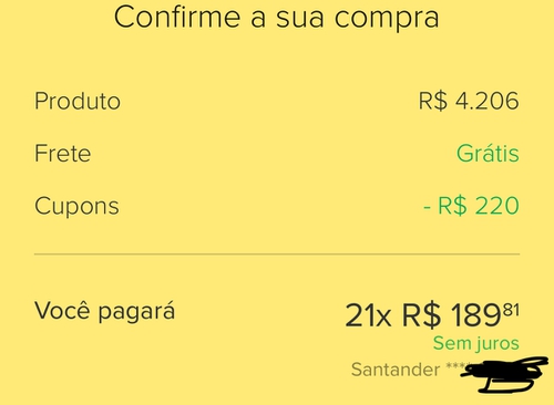 Comprando com cartão Santander e usando os cupons ELETRO120 + SANTANDER100 fica em R$3986 em até 21x sem juros