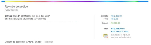 iPhone SE Apple 64GB Preto 4,7” 12MP iOS | R$2324