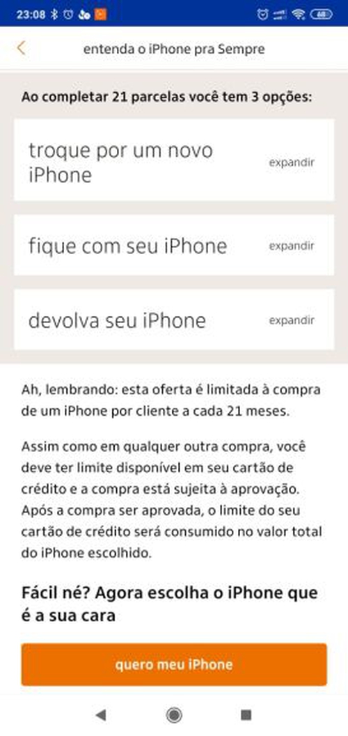Obrigação até que chegue o prazo de trocar por um novo (apesar de iPhone não sofrer tanto assim de uma geração pra outra, mas é uma clausula que te amarra e acaba pesando no fim das contas). No fim das contas, o valor da diferença q vc deixa de devolver será revertido em uma outra fidelização por mais 21 meses .. e assim vai... sem falar q pode ser roubado, ter a tela trincada ou o aparelho danificado, etc. todos os reparos ficando por sua conta. Tá longe disso ser um negócio de futuro