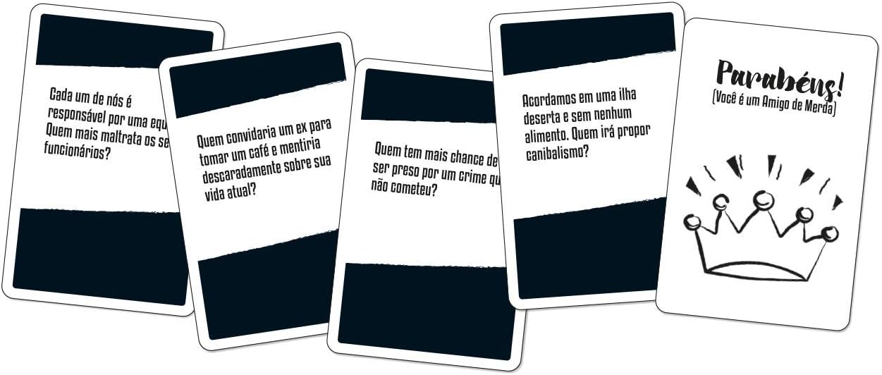 Alguém puxa uma carta e faz uma pergunta. Todos os outros imediatamente apontam para quem eles acham que "cumpre" perfeitamente os requisitos da pergunta. O mais votado ganha! Aquele que ganhar 5 vezes é coroado o amigo de merda.