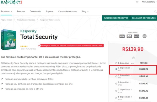 No site oficial da Kaspersky Lab é vendido por R$139,90.