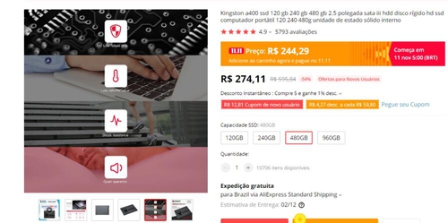 Kingston a400 ssd 120 gb 240 gb 480 gb 2.5 polegada sata iii - R$97