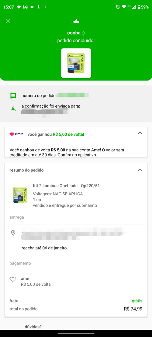 Valeu. Deu R$74,99 e pra mim pagando com AME vou ganhar R$5,25 DE CASHBACK(sim, apesar de mostrar R$5,00 aqui no app, lá no AME mostra R$5,25)Aqui apliquei cupom 15 reais , frete grátis, e ainda foi pelo ame retornando 5 reais, saiu por R$ 69,90 aproximadamente.