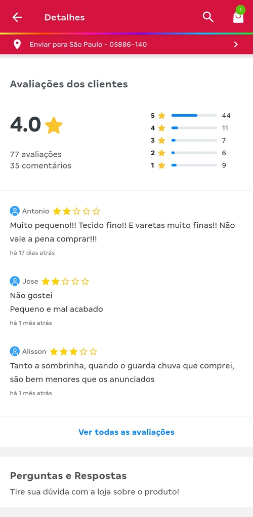 comprei na última promoção e retirei na loja, acho que vale o preço pois fica menos de 12 reais cada. óbvio que não é grande coisa, a estrutura é fraca e não aguenta vento forte, diz que é grande mas tá mais para médio, ponto positivo por ser automático para abrir. enfim, quebra o galho, melhor que tomar chuva.