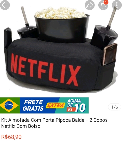 Compro um balde de 18L por 5 reais aqui perto, pinto de canetinha Netflix colorido ainda, já tenho copos e canudos e almofadas, então, economizei uma grana