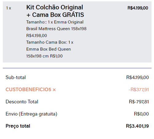 O kit é Você compra o Colchão e ganha grátis a cama BOX ( a cama box sai de graça ) segundo descrição do próprio site da Emma.