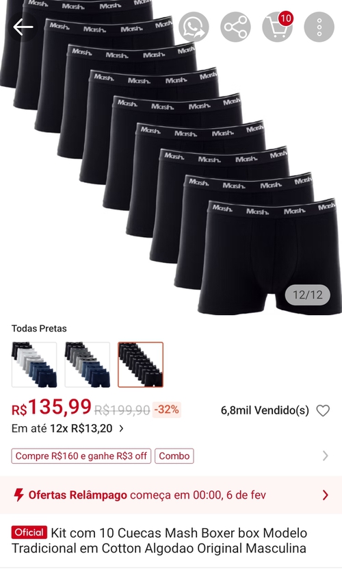 Kit com 10 Cuecas Mash Boxer box Modelo Tradicional em Cotton Algodao