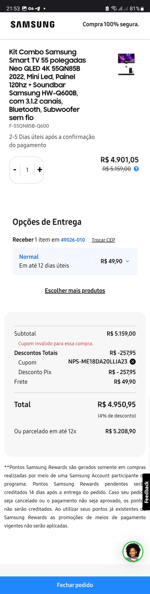 Tenho até terça pra decidir. Paguei um preço bom considerando o soundbar que resgatei. Acho que se eu devolver vão cancelar o envio do brinde.Tô pensando se fico e depois aciono a garantia.Cupom invalido