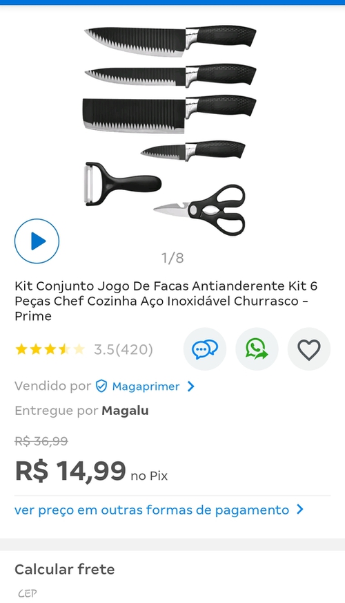 Galera, vejam os comentários, essas facas não vale 1 real, são de péssima qualidade, todo mundo reclamando