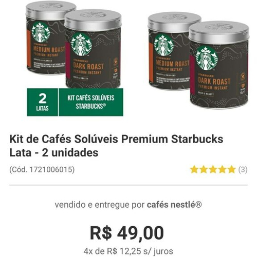 Kit de Cafés Solúveis Premium Starbucks Lata - 2 unidades | R$ 49