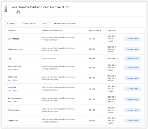 Menor preço segundo o Google Shopping, considerando o valor unitário do litro