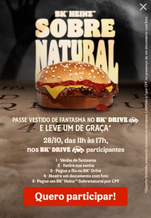 Vale lembrar que a promoção é limitada a 1 resgate por CPF. Ação disponível apenas no próximo sábado, dia 28/10/2023, das 11h às 17h ou enquanto durarem os estoques (não informados). Itens adicionais ou troca de itens serão cobrados à parte.