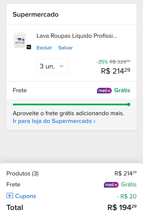 Não tenho meli, daí saiu 230 com frete. Mas ainda é vantagem, por um bom tempo não vou me preocupar com sabão e nem carregar peso comprando no mercado que sairia uns centavos mais caro. Obrigado.