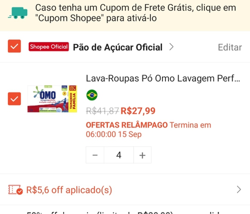 adicionar 4 unidades e ativar o desconto de 5,60, e depois resgatar cupom de 10,00 do pao de açúcar na aba inicial cupons e aplicar. fica 96,36
