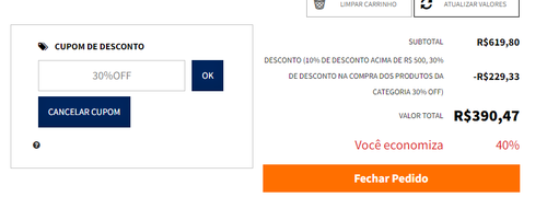 Pessoal, vocês devem adicionar R$500,00 em produtos, o site vai calcular automaticamente 10% de desconto, após isso, adicionem o cupom 30%OFF, acumulando vai ficar 37%.