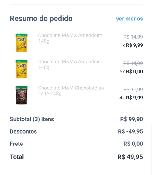 Eu consegui 10 m&m por 49,95Sou do ES e consegui pegar aqui. 4 m&ms de chocolate, 4 kinderbueno e 2 ferreiro por 45 reais, retirada grátis.
