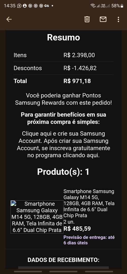 Fui nos meus pedidos no app da Samsung e nem tá gerando o boleto. Kkkk