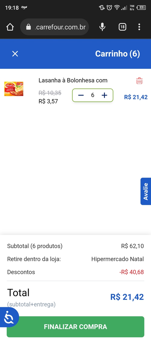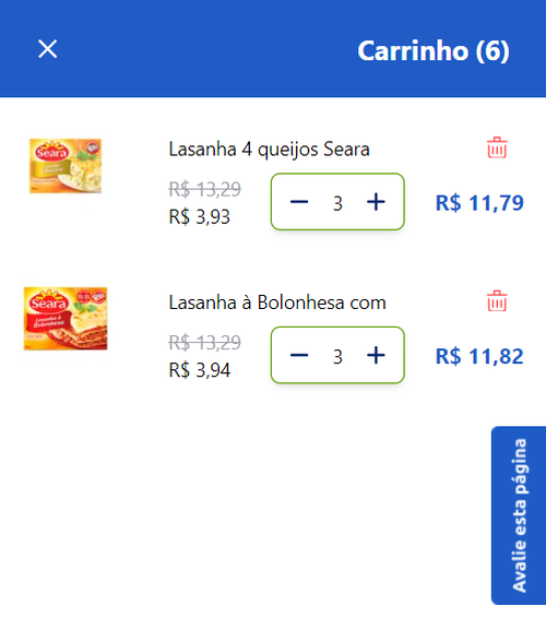 Obs.: Acrescente mais alguns itens à sua compra, até completar pelo menos R$ 30,00, pois esse é o valor mínimo de compra exigido pelo Carrefour. Para não alterar o valor das lasanhas, os itens acrescentados não devem ser da Seara.