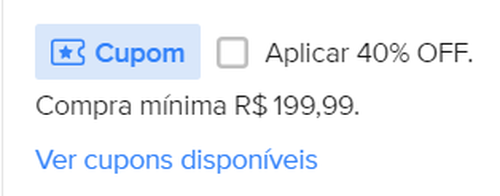 Pegar este cupom de 40% OFF em Grandes Marcas Em produtos selecionados Compra mínima: R$ 199,99