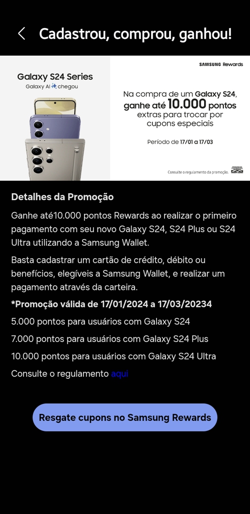 Cadastrei qualquer cartão válido e realize uma compra de qualquer valor e ganhe até 10.000 pontos no Samsung Rewards na primeira compra.