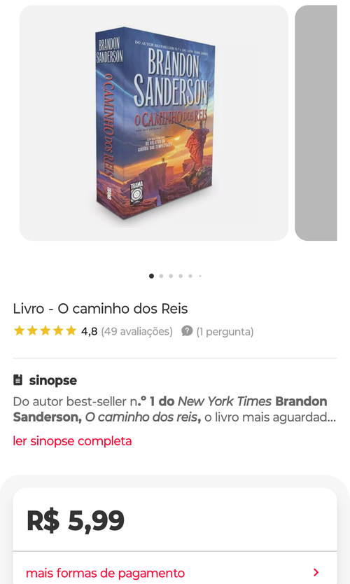 Do autor best-seller n.º 1 do New York Times Brandon Sanderson, O caminho dos reis, o livro mais aguardado de todos os tempos, chega ao Brasil iniciando uma incrível saga épica. Roshar é um mundo de pedras e tempestades. Essas estranhas tormentas, de incrível poder, varrem o terreno rochoso com tanta frequência que terminaram moldando não apenas a ecologia, mas também a civilização. Animais que se escondem em conchas, árvores de galhos rígidos e uma vegetação que se retrai e se revela. As cidades só podem ser construídas onde a topografia oferece abrigo. Já se passaram séculos desde a queda das dez ordens conhecidas como os Cavaleiros Radiantes, mas suas Armaduras e Espadas Fractais permanecem: objetos místicos que transformam seres comuns em guerreiros praticamente invencíveis. Homens dão seus reinos em troca das Espadas Fractais. Guerras são travadas por elas, e são elas que garantem a vitória. Uma dessas guerras ocorre em uma paisagem inóspita conhecida como Planícies Quebradas. Lá, Kaladin, que abandonou seus estudos de medicina em troca de uma lança para proteger seu irmão mais novo, foi reduzido à escravidão. Agora, em meio a um conflito que parece não fazer sentido, no qual dez exércitos lutam isoladamente contra um único inimigo, Kaladin busca manter seus homens enquanto sonda os outros líderes. O Luminobre Dalinar Kholin comanda um dos exércitos. Assim como seu irmão, o falecido rei, ele é fascinado por um texto antigo chamado O caminho dos reis. As visões dos tempos antigos e dos Cavaleiros Radiantes o fazem duvidar até da própria sanidade. Do outro lado do oceano, a jovem Shallan, ainda inexperiente, procura realizar seu treinamento com a Luminosa Jasnah Kholin, a sobrinha herege de Dalinar. Embora aprecie o aprendizado, a motivação de Shallan não é tão nobre assim. Enquanto planeja um roubo um tanto ousado, a pesquisa que faz para Jasnah sugere segredos dos Cavaleiros Radiantes ― e a verdadeira causa da guerra. Após mais de dez anos de planejamento e construção deste universo único, O caminho dos reis é o fantástico capítulo de abertura de Os Relatos da Guerra das Tempestades, uma obra-prima de grande magnitude que continua a ser elaborada. Volte a dizer os antigos juramentos: Vida antes da morte. Força antes da fraqueza. Jornada antes do destino. E devolva aos homens os Fractais que outrora portaram. Os Cavaleiros Radiantes devem se erguer novamente.