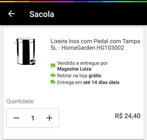 Rafael, altera a descrição desse também porque adicionando um outro produto de 10 reais em vez de outra unidade dessa lixeira, o valor cai para 24 reais.
