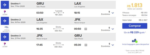 As datas para viajar nesse preço são:(07/02) São Paulo Los Angeles (14/02) Los Angeles Nova York (21/02) Nova York São Paulo