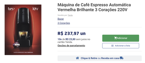 Máquina de Café Espresso Lov Automática Vermelha Brilhante 3 Corações 220V