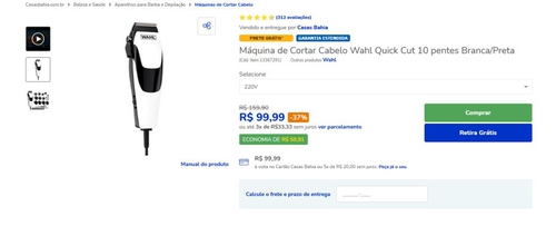 Máquina de Cortar Cabelo Wahl Quick Cut 10 pentes Branca/Preta 110/220V | R$ 99
