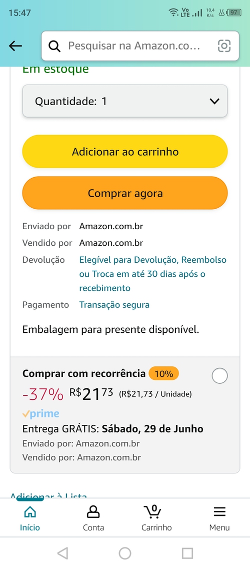 Na compra recorrente sai R$ 21,73.
