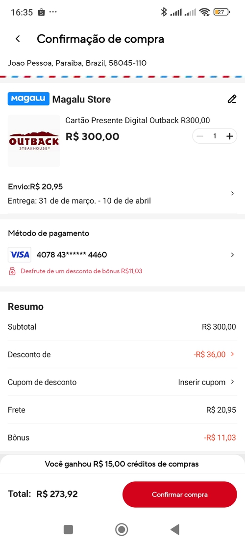 【Magalu 】Gift Card Digital Outback 300 Reais