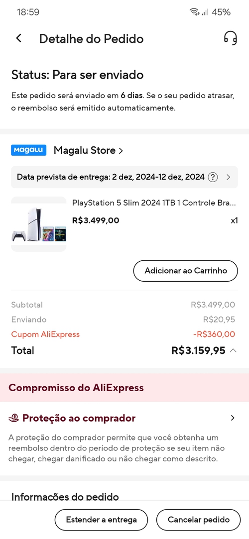 Recebi ontem o PS5. No aliexpress continuava aparecendo como não enviado. Hj o aliexpress reembolsou automaticamente o pedido. E agora?