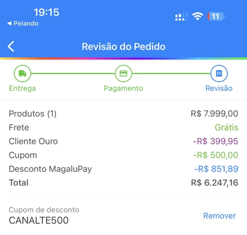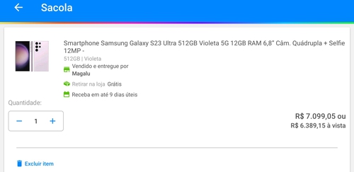 1- Entrar no link do pelando acima2- Clicar em "pegar promoção" e ser redirecionado para o app Magalu3- Procurar por "S23 ultra"Não tô conseguindo chegar neste valor... alguém pode me ajudar por favor?