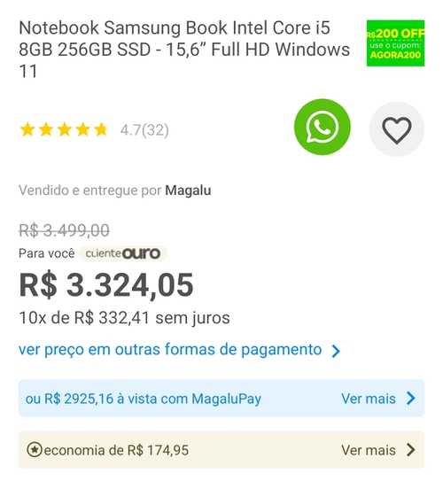 [MAGALUPAY + CLIENTE OURO R$2.725,16] Notebook Samsung Book Intel Core i5 8GB 256GB SSD