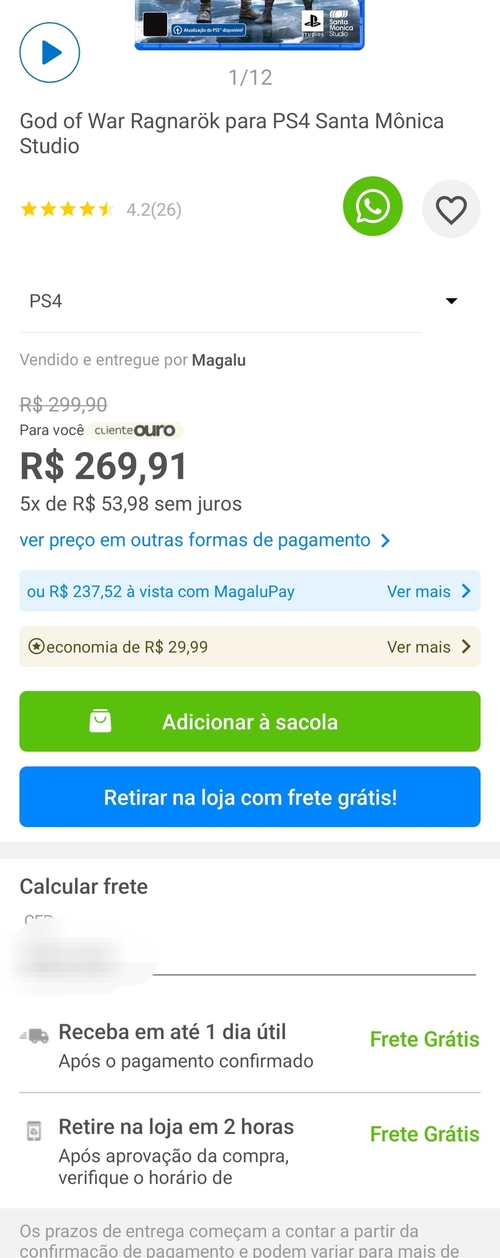 Aqui deu frete grátis ou retirada em loja.